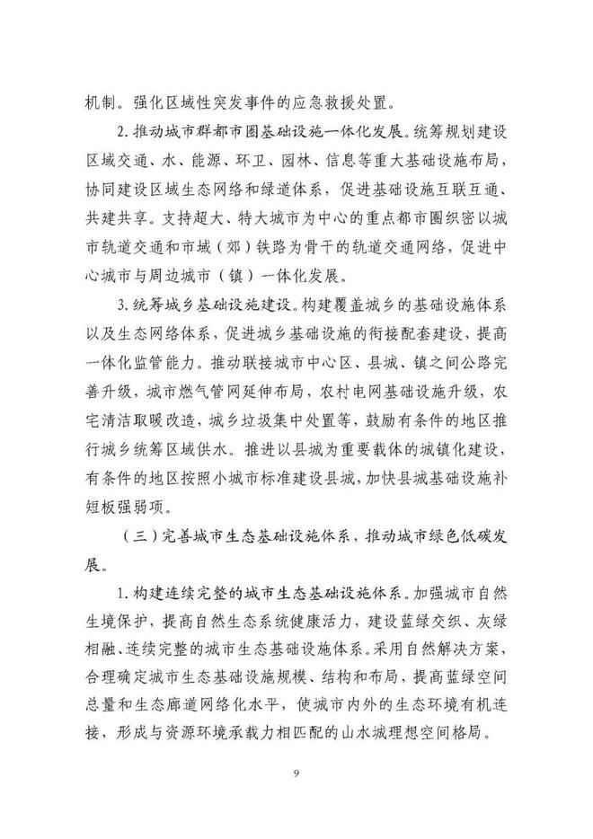 《規劃》圍繞構建系統完備、高效實用、智能綠色、安全可靠的現代化基礎設施體系,提出4方面重點任務。一是推進城市基礎設施體系化建設,增強城市安全韌性能力。二是推動城市基礎設施共建共享,促進形成區域與城鄉協調發展新格局。三是完善城市生態基礎設施體系,推動城市綠色低碳發展。四是加快新型城市基礎設施建設,推進城市智慧化轉型發展。