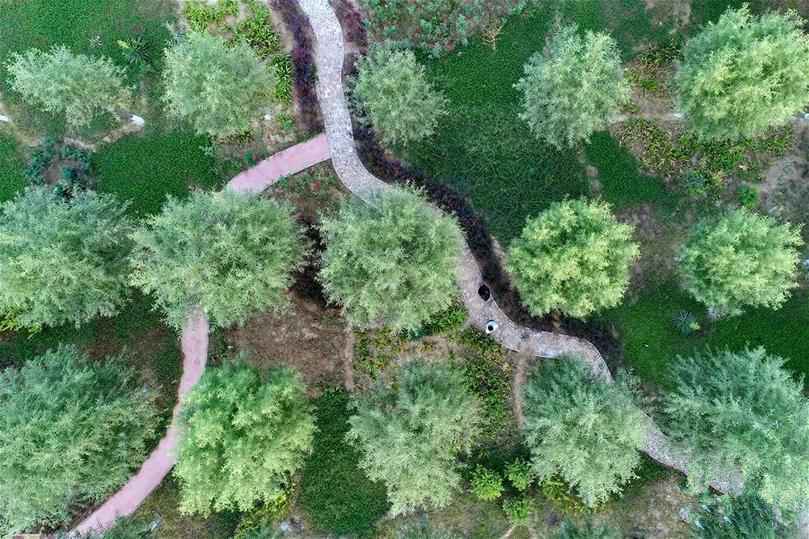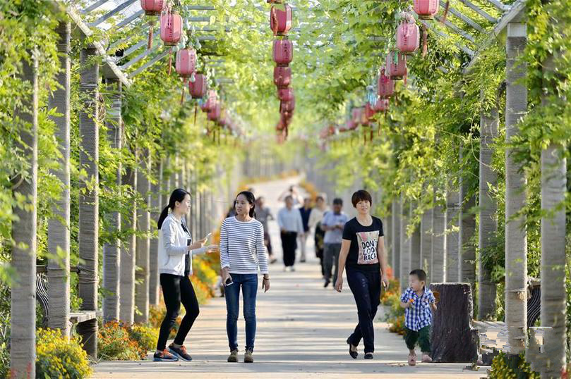游客在河北省巨鹿縣金玉莊村金銀花園藝小鎮內游覽