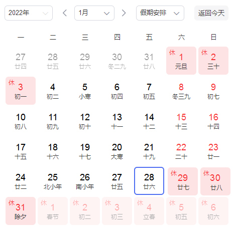 1月29日(星期六,農(nóng)歷臘月二十七)至2月6日(星期日,農(nóng)歷正月初六)為春節(jié)假期,共9天。2月7日(星期一,農(nóng)歷正月初七)正式上班。