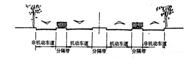 以兩條分隔帶隔離機(jī)動(dòng)車與非機(jī)動(dòng)車車道,將車行道一分為三的橫斷面形式。