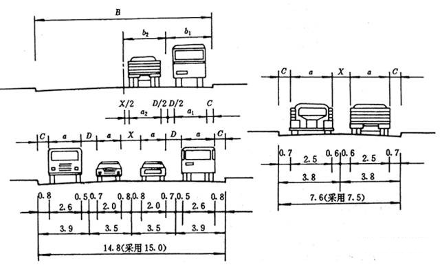 1).居民區(qū)級(jí)道路:道路紅線之間的道路各項(xiàng)用地寬總和。