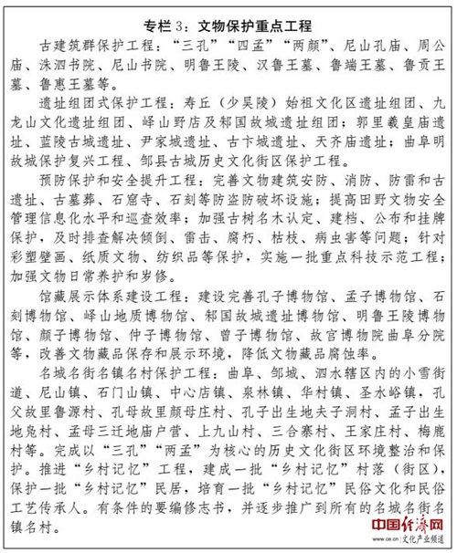 (三)建設(shè)國家記憶工程先行區(qū)。充分發(fā)揮擁有史前文化完整序列和脈絡(luò)清晰文化譜系的優(yōu)勢,加強文化遺產(chǎn)及大遺址保護,做好古建筑、古遺址的文物本體維修,實施搶救性保護、預(yù)防性保護和科學(xué)修復(fù)工程;加強文物資源系統(tǒng)梳理、典籍文獻搜集整理編纂保護,建設(shè)儒家文化資源數(shù)據(jù)庫;擴大文物資源對公眾的開放度,推動博物館文創(chuàng)產(chǎn)品開發(fā),建設(shè)全國文化遺產(chǎn)保護利用示范區(qū),在實施國家記憶工程進程中走在前列。