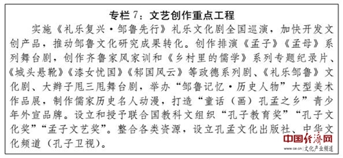 (四)打造儒藝創(chuàng)意文化產(chǎn)業(yè)基地。以曲阜新區(qū)國家級文化產(chǎn)業(yè)示范區(qū)和孟子湖新區(qū)為重點,突出創(chuàng)意文化環(huán)節(jié)的開發(fā)和拓展,推動創(chuàng)意文化產(chǎn)業(yè)與其他產(chǎn)業(yè)的相互滲透和融合發(fā)展,建設(shè)具有儒家特色的創(chuàng)意文化產(chǎn)業(yè)集群。依托文化文物單位館藏文化資源,充分采用數(shù)字化、信息化技術(shù),研發(fā)推出工藝精良、制作精美的文物創(chuàng)意產(chǎn)品、旅游紀(jì)念品和衍生創(chuàng)意產(chǎn)品,促進文化創(chuàng)意產(chǎn)品創(chuàng)新發(fā)展。大力發(fā)展以儒家文化品牌為主導(dǎo)的動漫產(chǎn)業(yè),積極加強基于虛擬現(xiàn)實技術(shù)的原創(chuàng)動漫游戲產(chǎn)品創(chuàng)作,構(gòu)建高端動漫、網(wǎng)絡(luò)游戲產(chǎn)業(yè)發(fā)展體系。積極推動與儒家文化品牌動漫有關(guān)的圖書、報刊、音像制品的發(fā)行出版,引導(dǎo)企業(yè)開發(fā)生產(chǎn)衍生產(chǎn)品。積極采用全景環(huán)繞、虛擬現(xiàn)實等技術(shù),創(chuàng)作一批影視精品、舞臺劇、音樂劇,打造高品質(zhì)旅游實景演藝產(chǎn)品,再現(xiàn)孔孟形象,反映儒學(xué)思想對人類文明的貢獻、春秋戰(zhàn)國時代的社會變革;積極加強與中央和省市各級電視臺、影視制作單位和網(wǎng)絡(luò)媒體的戰(zhàn)略合作,爭取建設(shè)影視基地。