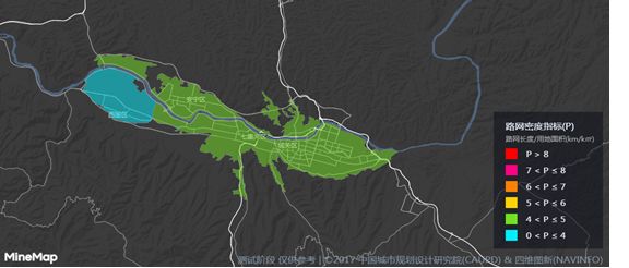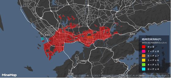 依托大數據平臺Minedata,中規院聯合四維圖新打造了一個以路網為基礎的數據可視化平臺,實現了城市道路網絡的動態監測,克服了傳統城市工作中道路網密度統計標準不統一、數據更新時效性差等問題,為合理控制城市道路網密度、促進城市交通規劃的落實提供了有效支持。