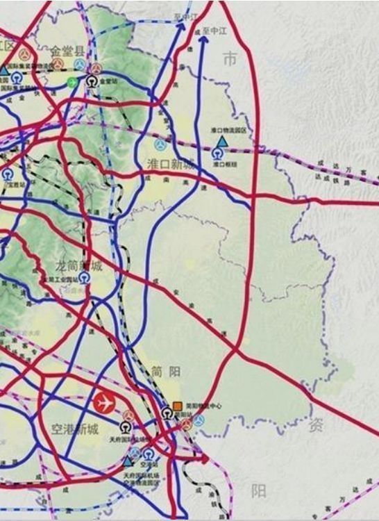 依托既有成渝鐵路、達成鐵路和規劃貨運外繞線,連接青白江國際鐵路港,融入 “ 蓉歐+ ” 。淮州新城預留國際鐵路港功能。規劃建設蓉昆高鐵成自段、成達萬高鐵等7條出川高鐵,融入國家高鐵網絡。推動成渝客專、遂成鐵路和蓉昆高鐵成自段等鐵路公交化運營,強化區域協作。依托18號線、13號線等軌道快線,實現中心城區和東部城市新區 “ 半小時 ” 到達機場。
