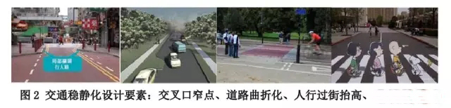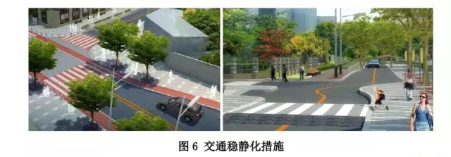 因此,在城市支路級別道路改造中,我們引入了城市交通穩(wěn)靜化(Traffic calming)理念,通過壓縮機(jī)動車道寬度、設(shè)置道路線型曲折化、縮小轉(zhuǎn)彎半徑以及路面鋪裝材料變化等措施,減少社區(qū)穿越性交通,實現(xiàn)對車速的管控,以保障居民出行及活動安全。