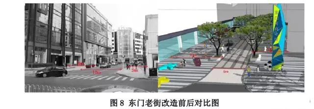 ● 東門老街:機(jī)動車道由10 米壓縮至6 米,兩側(cè)人行道分別從5 米加寬至7 米,從8米加寬至10米。