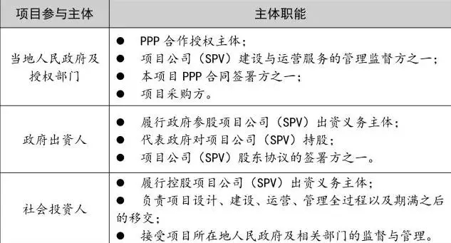 農(nóng)村生活污水治理工程PPP項(xiàng)目參與主體主要包括項(xiàng)目所在地人民政府及授權(quán)部門、政府出資人及社會投資人。本項(xiàng)目參與主體的具體職能見下表所示: