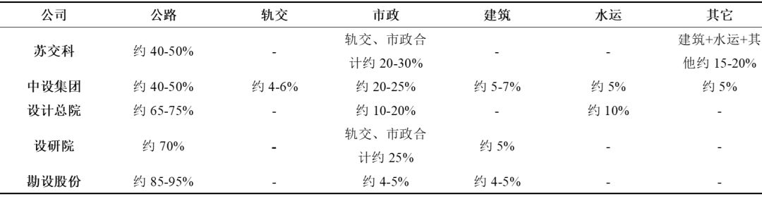 主要基建設(shè)計公司目前基建細(xì)分設(shè)計業(yè)務(wù)占比對比:公路設(shè)計較高