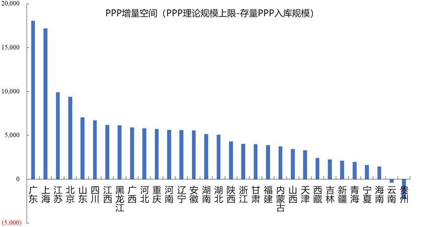 我們基于地方財政基礎(chǔ)測算PPP潛在空間。從整體來看,估算的大多數(shù)省份PPP項目潛在總增量均為正值,但區(qū)域數(shù)據(jù)差異較大。東部沿海發(fā)達(dá)省份PPP項目潛在增量規(guī)模最大,而中西部省份相對較小。