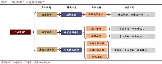 過去30年,中國城鎮(zhèn)化取得了跨越式發(fā)展,工業(yè)化水平也不斷提升,相應的交通、能源基礎設施投資經(jīng)歷了快速發(fā)展。但由于市政基礎設施建設相對滯后,交通擁堵、空氣污染、環(huán)境污染、固廢堆積等“城市病”日益嚴重。為治理“城市病”,近年來市政建設占基建投資的比重已從2002年的7.5%提升至2017年的47.4%,未來這一趨勢有望延續(xù),投資的重心預計在城軌建設、地下空間建設和生態(tài)環(huán)保建設3個方面。
