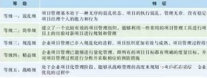 設計院向工程公司轉型升級,需要提升管理能力,如項目管理能力、商務和法律能力、專業采購和分包管理能力、信息化建設和運用能力等,這都是擺在傳統設計院面前的新課題。特別是項目管理能力的打造,是能否實現轉型的關鍵,只有真正具備了較為完善的項目管理能力,企業才能以工程公司模式順暢運作。根據項目管理理論,企業的項目管理能力可分為5個等級,見表1。