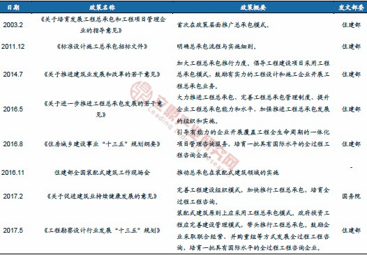 ——自2003年開始,國家陸續(xù)出臺政策推廣總承包模式,并引導(dǎo)裝配式建筑原則上使用總承包模式。2016年住建部發(fā)布《關(guān)于進(jìn)一步推進(jìn)工程總承包發(fā)展的若干意見》,《意見》強(qiáng)調(diào)大力推進(jìn)工程總承包,提升項(xiàng)目可行性研究和初步設(shè)計(jì)深度,實(shí)現(xiàn)設(shè)計(jì)、采購、施工等各階段工作的深度融合,提高工程建設(shè)水平。