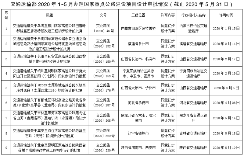 交通運輸部2020年1~5月辦理國家重點公路建設(shè)項目設(shè)計審批情況(截止2020年5月31日)
