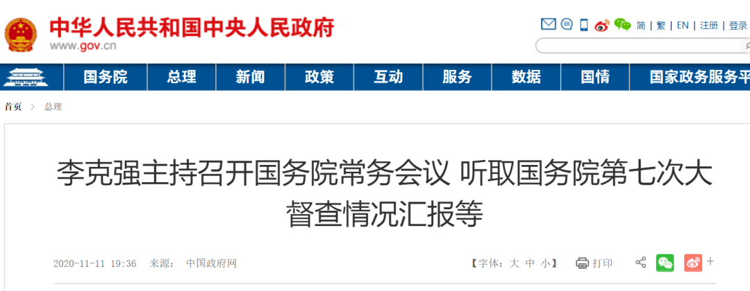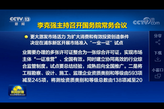 國務院總理李克強11月11日主持召開國務院常務會議,聽取國務院第七次大督查情況匯報,確保政策落實,更好發(fā)揮促進經(jīng)濟穩(wěn)定恢復的重要作用;決定在浦東新區(qū)開展市場準入“一業(yè)一證”試點,在全國大幅壓減建設工程企業(yè)和測繪資質(zhì)并加強監(jiān)管,更大激發(fā)市場活力,為擴大消費和有效投資創(chuàng)造條件。