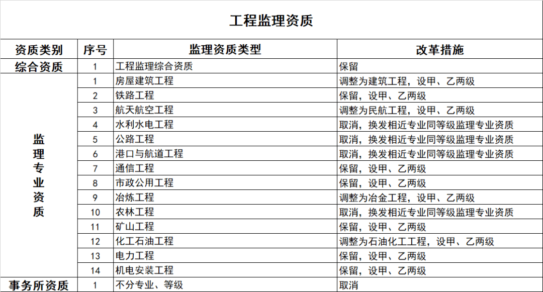 監(jiān)理專業(yè)資質(zhì)等級壓減為甲、乙兩級,原丙級資質(zhì)并入相應專業(yè)的乙級資質(zhì)。取消事務所資質(zhì)。