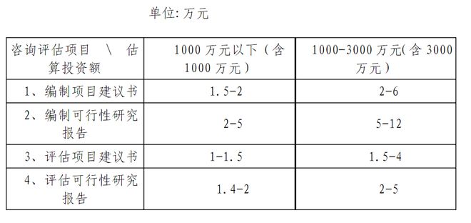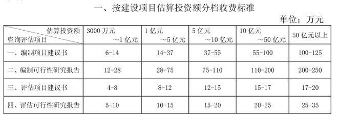 投資決策咨詢包括編制項目建議書、編制可行性研究報告、評估項目建議書、評估可行性研究報告等,取費可參考《國家計委關于印發(fā)建設項目前期工作咨詢收費暫行規(guī)定的通知》(計價格〔1999〕1283號),該文件提出了投資額在3000萬元以上的建設項目前期工作咨詢收費標準,而投資額3000萬元以下的建設項目由各省自行制定,如湖北省制定了相應的地方標準——《省物價局關于制定估算投資額3000萬元以下建設項目前期工作咨詢收費標準的通知》(鄂價房服〔2001〕107號),具體收費標準根據(jù)估算投資額在收費標準相對應的區(qū)間內(nèi)用插入法計算。