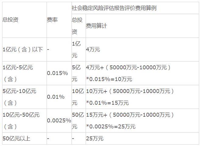 社會穩(wěn)定風險評估咨詢?nèi)≠M可參考地方收費標準,如上海市地方標準——《上海市重點建設項目社會穩(wěn)定風險評估咨詢服務收費暫行標準》(滬發(fā)改投〔2012〕130號),以估算總投資額為計費基數(shù),根據(jù)建設項目不同的性質、內(nèi)容和所處區(qū)域,采取按估算投資額分檔定額計費。