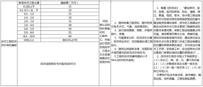 防洪評價咨詢?nèi)≠M可參考地方收費標準,如湖南省地方標準——《湖南省物價局、湖南省水利廳關于公布水利系統(tǒng)服務性收費項目和標準的通知》(湘價服〔2013〕134號),具體如下: