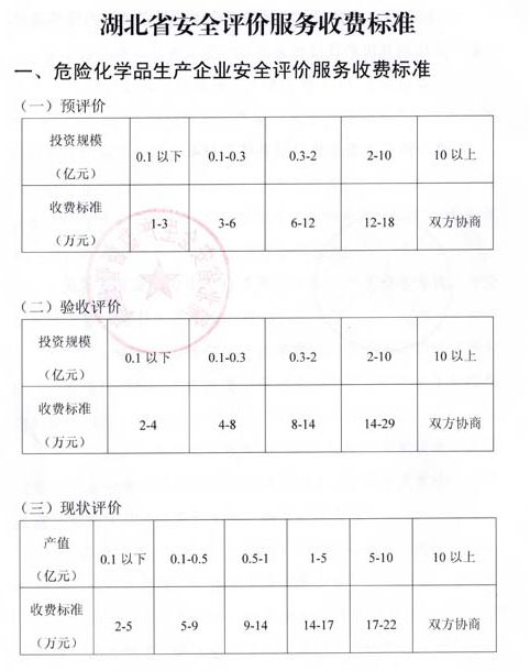 安全評價可參考地方收費標準,如湖北省地方收費標準——《省物價局 省安全生產(chǎn)監(jiān)督管理局關于安全評價服務收費有關問題的通知》(鄂價工服〔2016〕56號),具體如下: