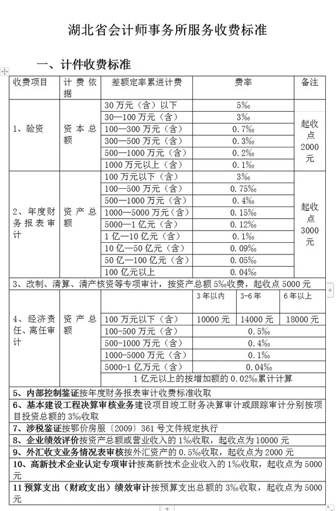 會計師事務所服務可參考地方收費標準,如湖北省地方標準——《湖北省物價局省財政廳關于印發(fā)<湖北省會計師事務所服務收費管理實施辦法>的通知》(鄂價規(guī)〔2010〕265號),具體如下: