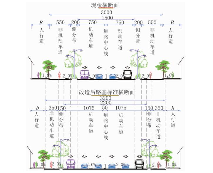 道路現(xiàn)狀為雙向 4 車道,橫斷面布置為 B 人行道 +5.5 m 非機(jī)動車道 +2 m 側(cè)分帶 +15 m 機(jī)動車道 +2 m 側(cè)分帶 +5.5 m 非機(jī)動車道 +B 人行道,B 現(xiàn)狀寬度為不小于 5.5 m。
