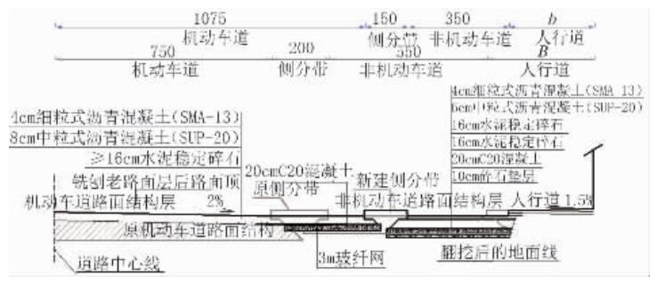 (2)針對拆除側(cè)分帶、壓縮非機(jī)動車道改建為機(jī)動車道段,建議采用 20 cm C20 混凝土進(jìn)行處理,新舊路基搭接頂面鋪設(shè) 3 m 玻纖網(wǎng)防止反射裂縫產(chǎn)生。