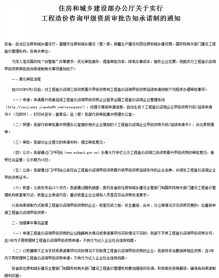 今年四月三十號(hào),就在不久前,住建廳又發(fā)布了廳關(guān)于實(shí)行工程造價(jià)咨詢甲級(jí)資質(zhì)審批告知承諾制的通知,重點(diǎn)是簡(jiǎn)化審批流程,和加強(qiáng)事中監(jiān)管。