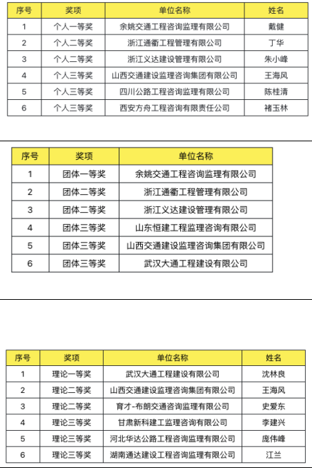 競賽現(xiàn)場賽程緊湊,氣氛緊張,選手靈活運(yùn)用自己的經(jīng)驗(yàn)和技能,尋找現(xiàn)場存在的質(zhì)量安全問題。經(jīng)過一天的激烈角逐,裁判組綜合研判,評定出個人、團(tuán)體、理論獎項(xiàng)如下圖,另有60名選手獲得優(yōu)勝獎,其中浙江選手包攬個人和團(tuán)體前三名。