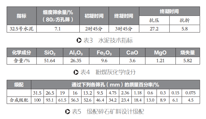 底基層:該路面結(jié)構(gòu)底基層采用水泥粉煤灰穩(wěn)定碎石,為減少半剛性基層材料層裂縫,需使用較高模量的水泥穩(wěn)定碎石,而高模量的路面結(jié)構(gòu)通常需使用較高劑量的水泥。但就半剛性基層材料自身的特性而言,高劑量水泥通常會使路面早期出現(xiàn)一定程度的干縮和溫縮裂縫。因此本文采用3%的32.5號水泥,同時結(jié)合摻加火力發(fā)電廠除塵裝置收集的粉煤灰,其水泥和粉煤灰技術(shù)指標(biāo)如表3、表4所示。