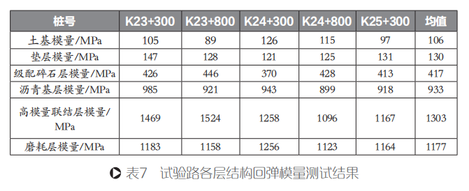 根據(jù)《公路路基路面現(xiàn)場測試規(guī)程》(JTG E60-2008),對試驗路各層施工完成后進(jìn)行現(xiàn)場回彈模量試驗,其測試結(jié)果如表7所示。
