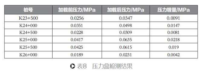為測量長壽命瀝青路面試驗路段土基頂面所受壓力,根據(jù)《公路路基路面現(xiàn)場測試規(guī)程》(JTG E60-2008)要求,在試驗路行車道上埋置壓力盒,測取在10t軸載單輪下的壓力值,具體檢測結(jié)果如表8所示。