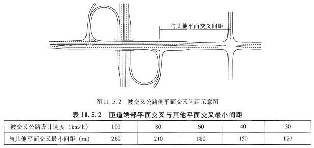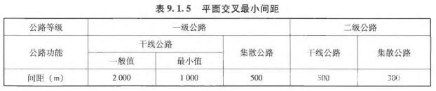 《標(biāo)準(zhǔn)》9.1.5條,針對(duì)不同功能定位、不同技術(shù)等級(jí)的公路平面交叉最小間距,應(yīng)不小于表中規(guī)定值。