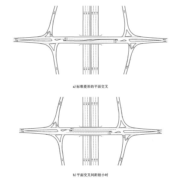 《規(guī)范》11.6.2條規(guī)定,菱形或苜蓿葉互通中的兩個(gè)平面交叉宜相互通視,凸曲線應(yīng)保證停車視距,間距應(yīng)容納兩個(gè)左轉(zhuǎn)車道,不宜設(shè)置人行橫道。