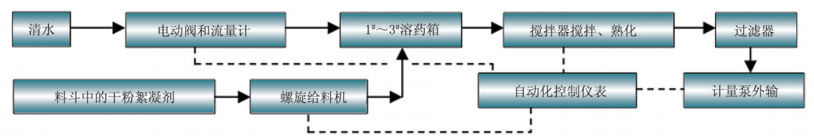 在污水處理系統(tǒng)中,為了除去或降低水中懸浮物,使其產(chǎn)生大顆粒的凝聚體,加快水中雜質(zhì)和污泥沉降速度,一般在污水處理的沉降部分加入一定濃度的絮凝劑。用于含油污水處理的絮凝劑包括無(wú)機(jī)絮凝劑、有機(jī)絮凝劑和復(fù)合絮凝劑 3 大類。為了保證加藥濃度、減輕工人勞動(dòng)強(qiáng)度和降低藥劑成本,應(yīng)用絮凝劑自動(dòng)加藥工藝技術(shù)。