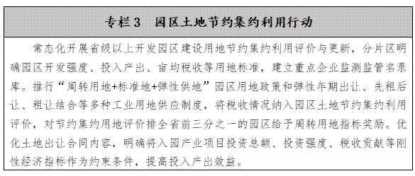 嚴格控制新增建設用地。發揮成片開發政策和計劃調節作用,科學核定城鎮新增建設用地規模,逐步減少農村建設用地規模,有效控制新城新區和開發區無序擴張。在省級以上開發園區繼續開展“標準地+承諾制”改革試點,建立土地精細化供應管理體系,服務“五好”園區建設。強化土地開發強度剛性約束,分行業制定產業項目用地投入產出強度指導標準,推進以地控稅、以稅節地、“畝均效益”綜合評價,落實單位GDP建設用地使用面積下降率的控制要求。完善“承諾供地時間+逾期公告撤批”制度,堅決防止新增批而未供土地。
