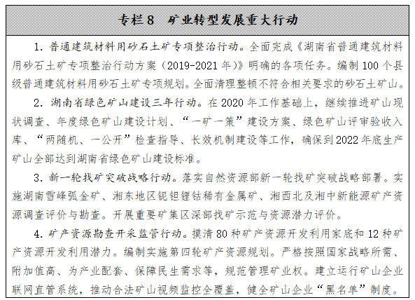 支持省屬國有礦企整合我省優勢礦產資源,引導省內頭部礦企通過強強聯合、兼并重組、境外并購和投資合作等方式,收購或控股一批勘查、開采、選冶加工企業,促進規?;?、集約化經營。針對不同的優勢礦種,實施不同的產業發展政策,培育一批我省優勢礦種的特色礦企。建立優勢礦產交易平臺,提高全省礦業企業行業地位,實現從產品優勢到市場優勢的轉型,提高湖南優勢礦產話語權。