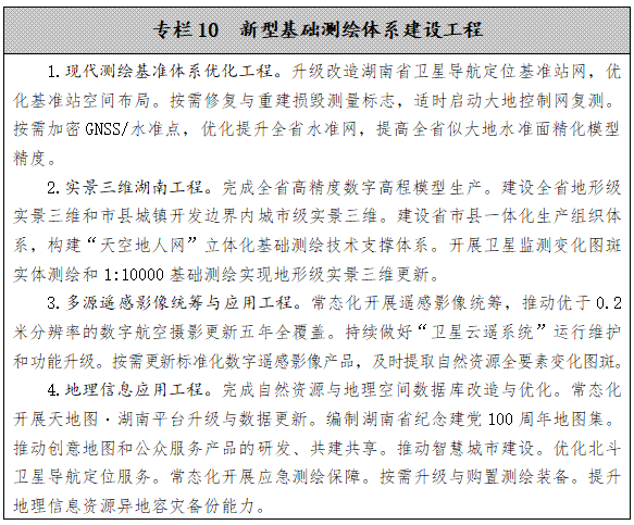 推進新型基礎測繪體系建設。在做好全省1:10000地形圖和市縣城鎮開發邊界內1:500地形圖生產更新的基礎上,以“滿足要求、貼近需求”為導向,推進新型基礎測繪體系和實景三維湖南工程建設,建立以實景三維湖南為核心的新型基礎測繪產品體系,帶動生產組織體系、標準政策體系、技術支撐體系和應用服務體系的全面重構。按照“試點驗證、按需精化、以用促建、省市聯動”的思路,基本建成覆蓋全面、更新及時、管控精準、立體直觀、承載力強的實景三維湖南和省級統籌、聯動更新、開放共享、按需服務的湖南省新型基礎測繪體系。
